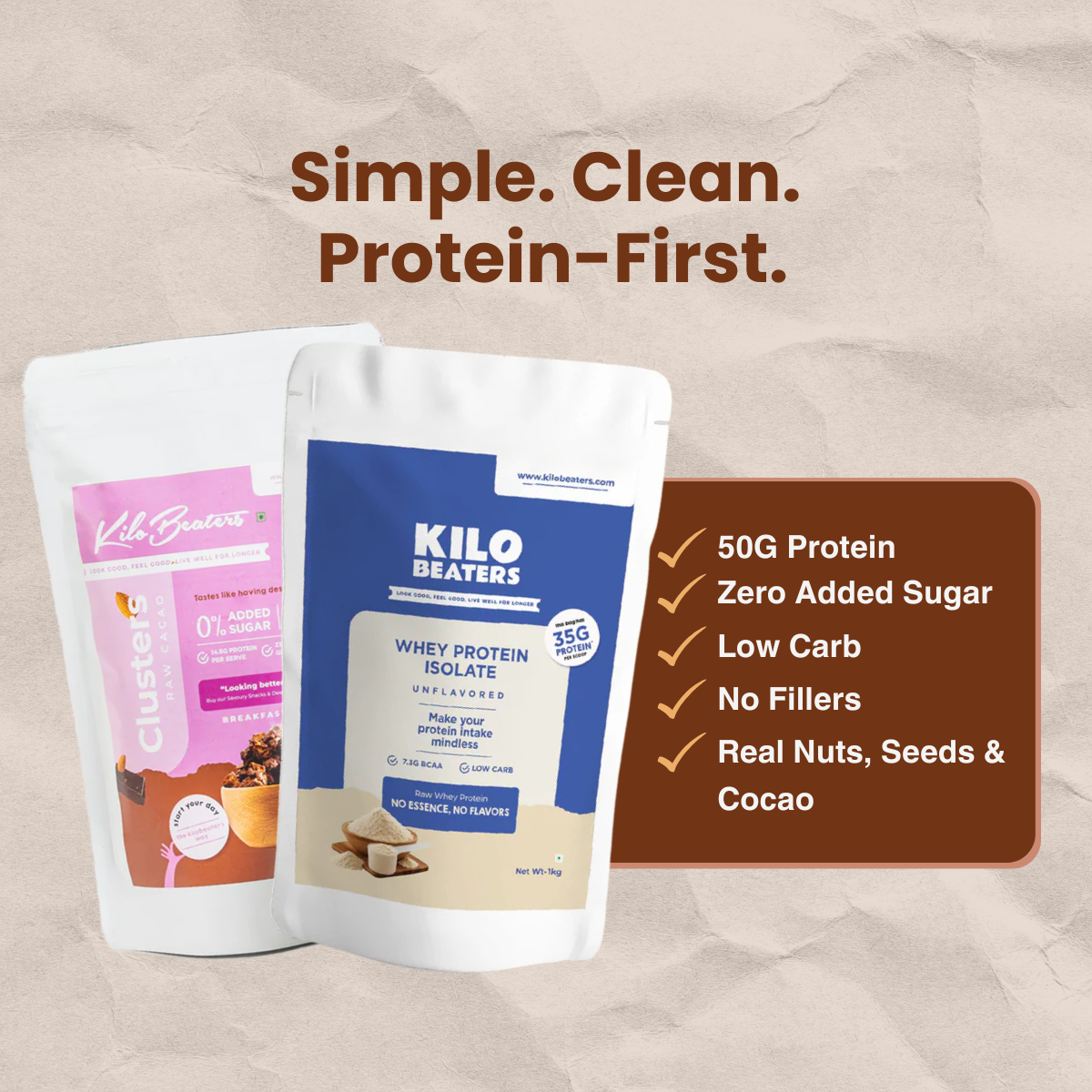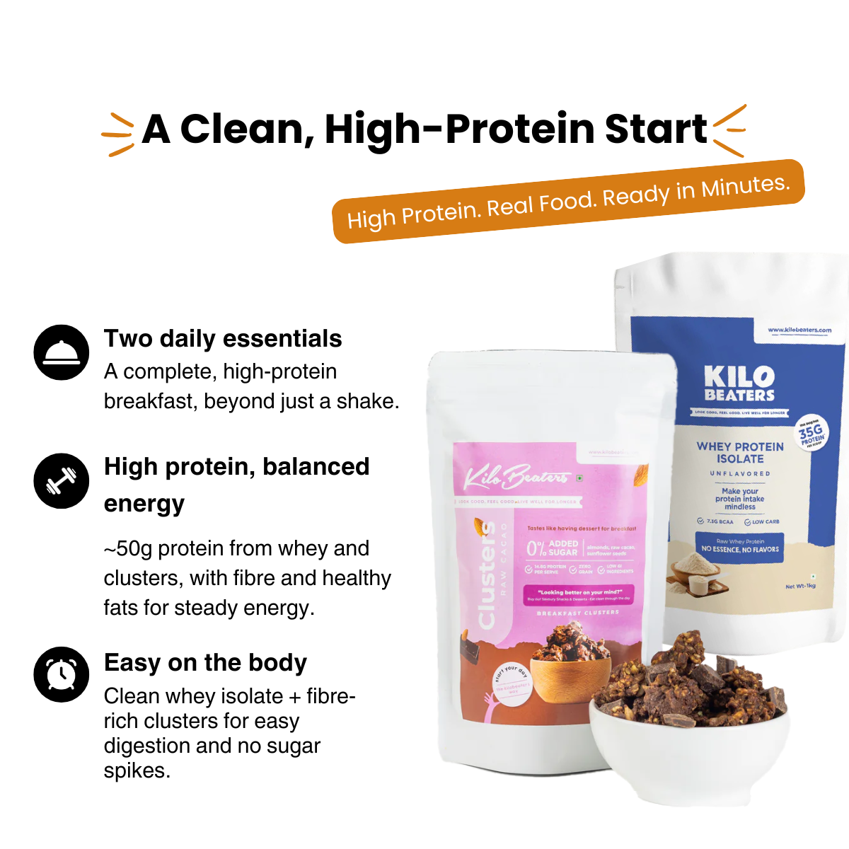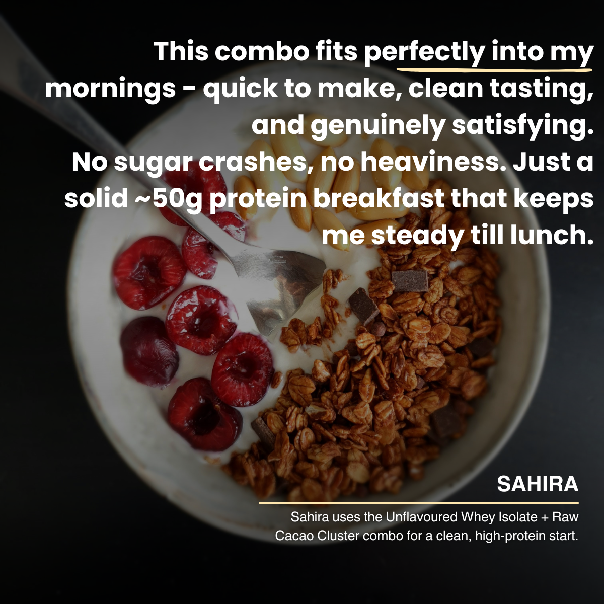 A high-protein breakfast pairing: unflavoured whey protein isolate + raw cacao breakfast clusters. Best for people who want a filling, protein-forward start (fitness, fat loss, busy mornings, sugar-control routines).