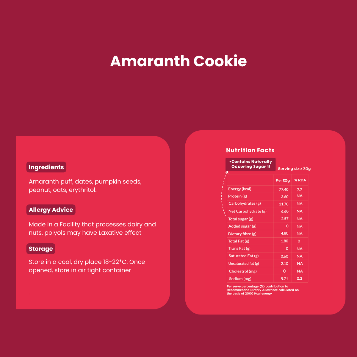| Nutrition | Per 100g | Per 30g | % RDA (Per 30g) |