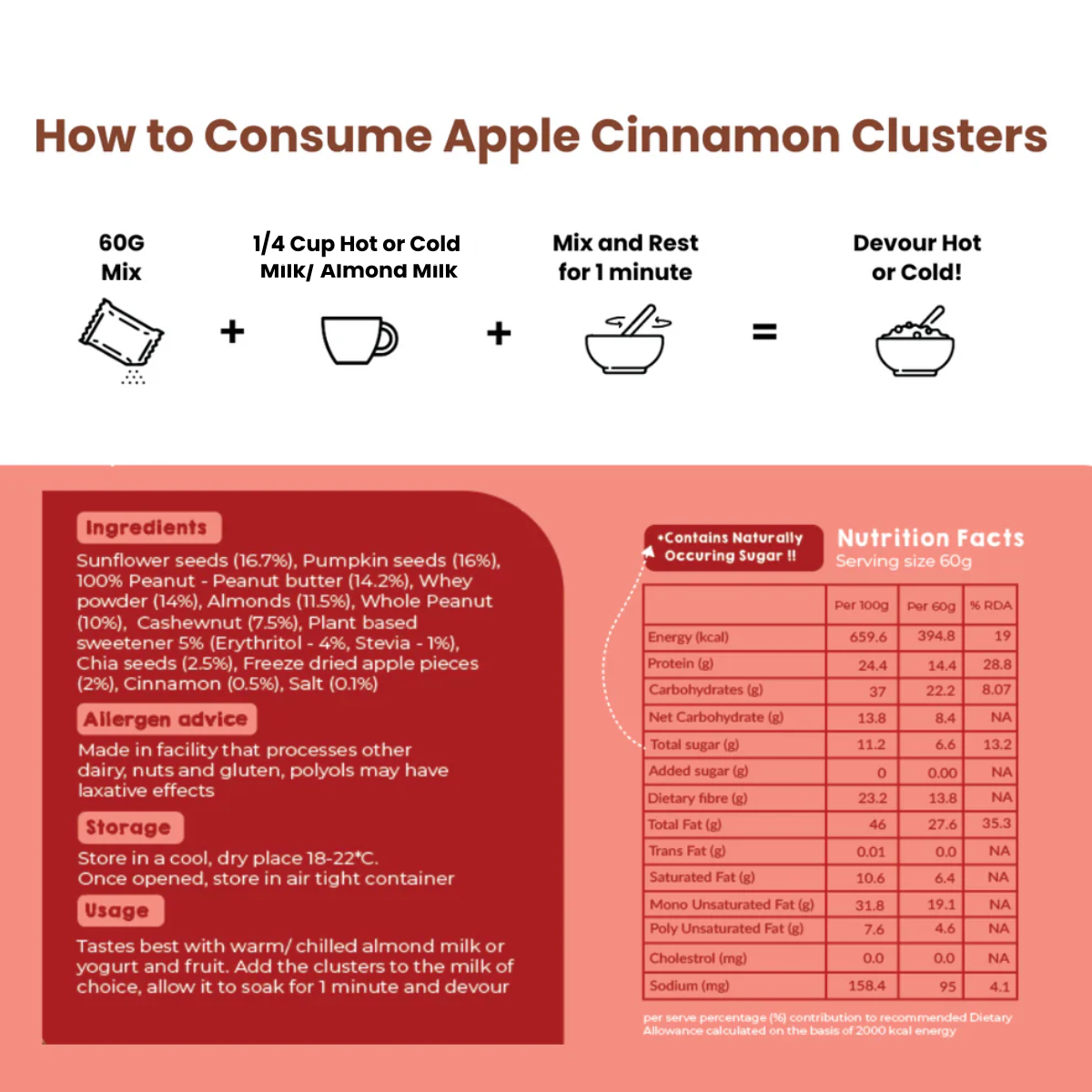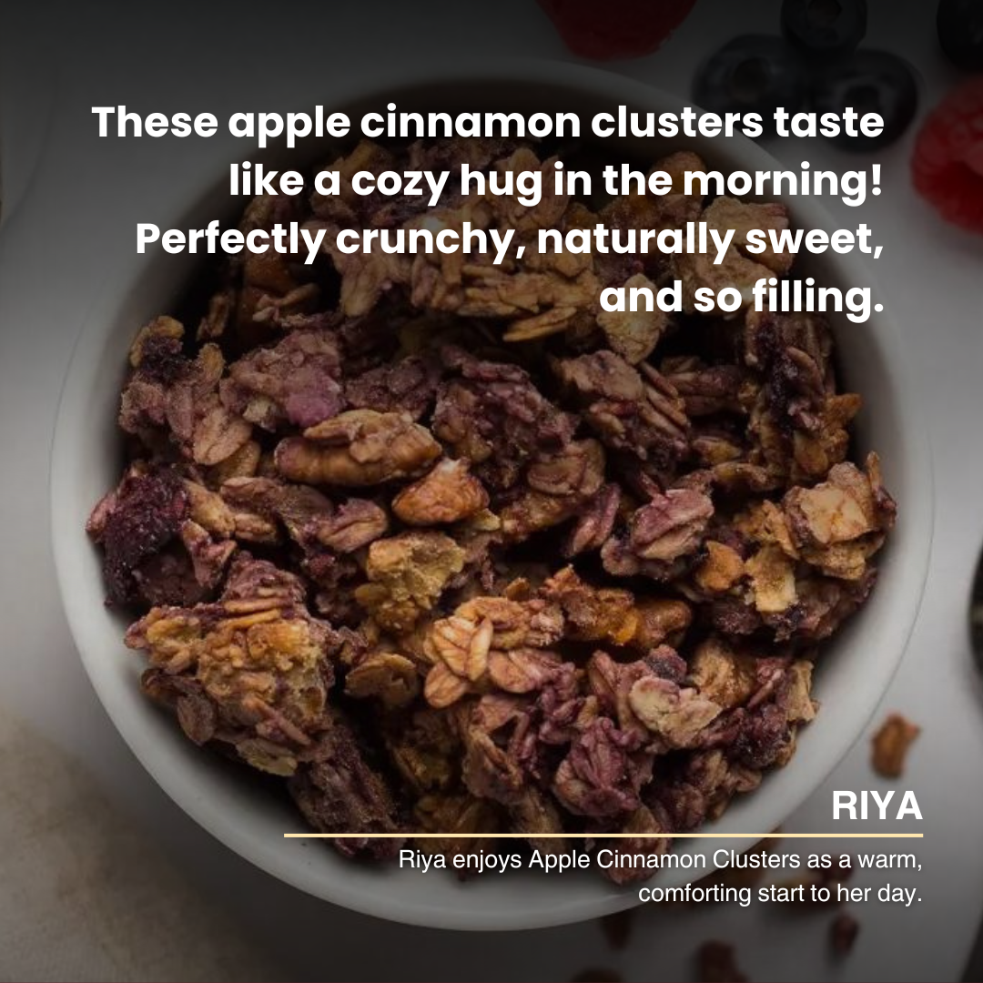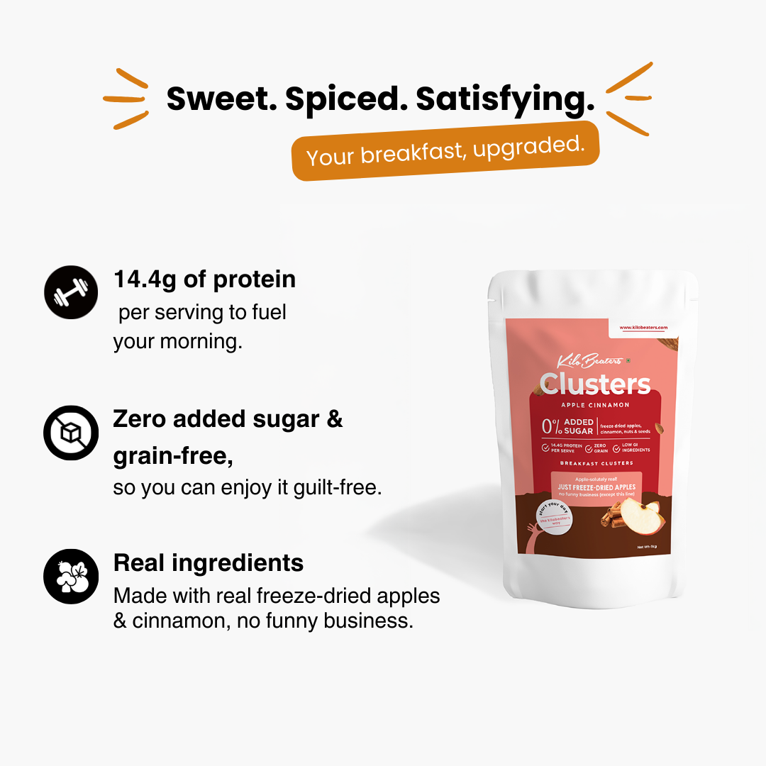 These clusters are high in protein (14.4g per serving), contain no added sugar, and are packed with nuts, seeds, and freeze-dried apples for balanced nutrition.