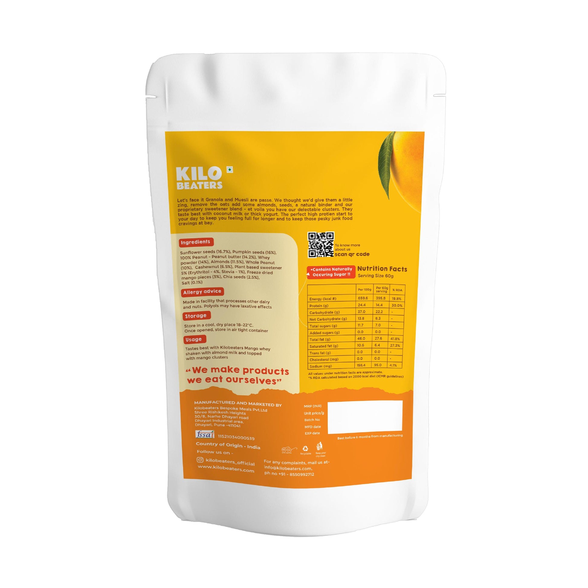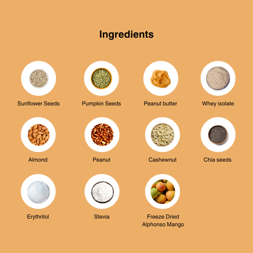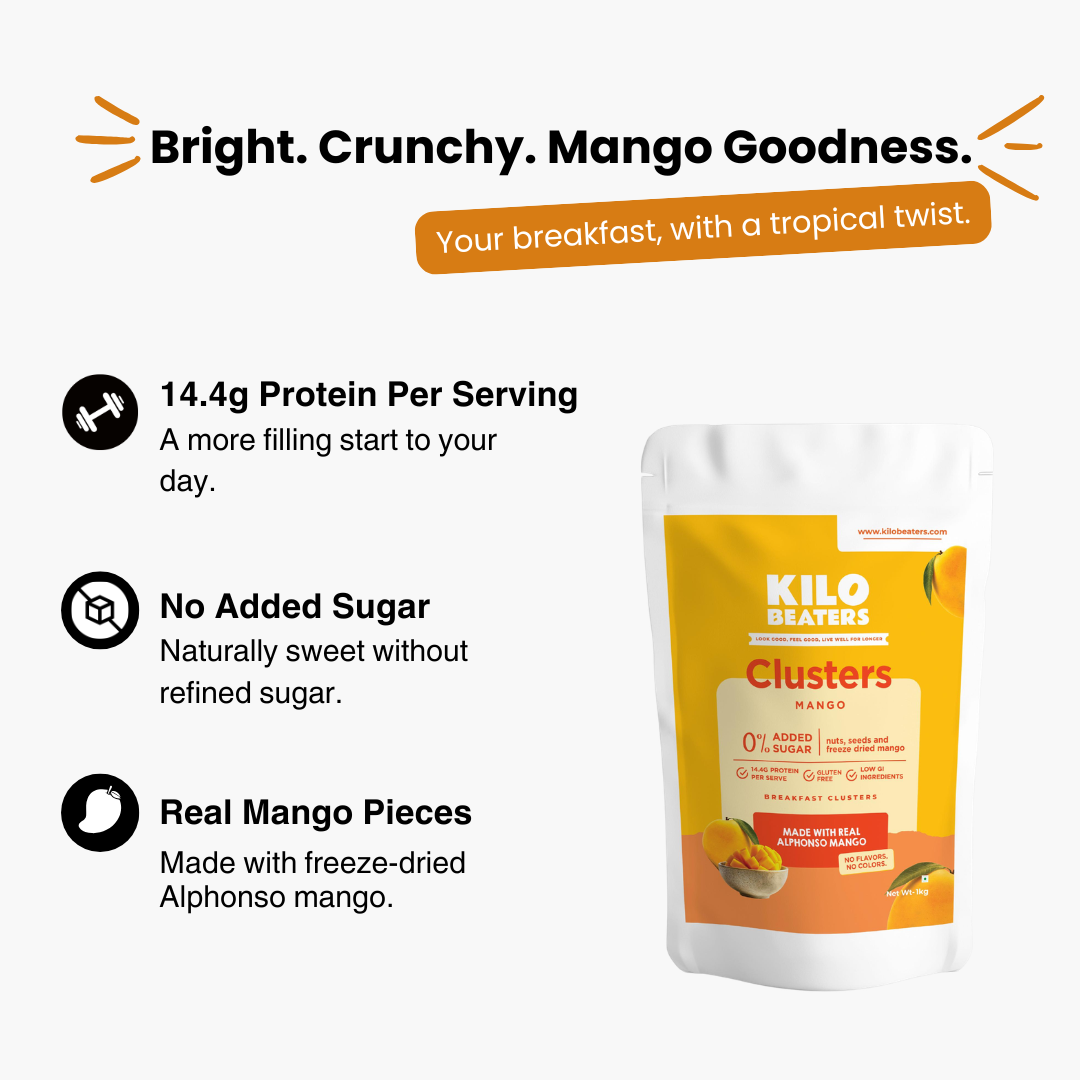 Mango Breakfast Clusters are high in protein and rich in healthy fats from nuts and seeds, which can help promote satiety and reduce unnecessary snacking. When included as part of a balanced diet, they can support better portion control and sustained energy through the morning.