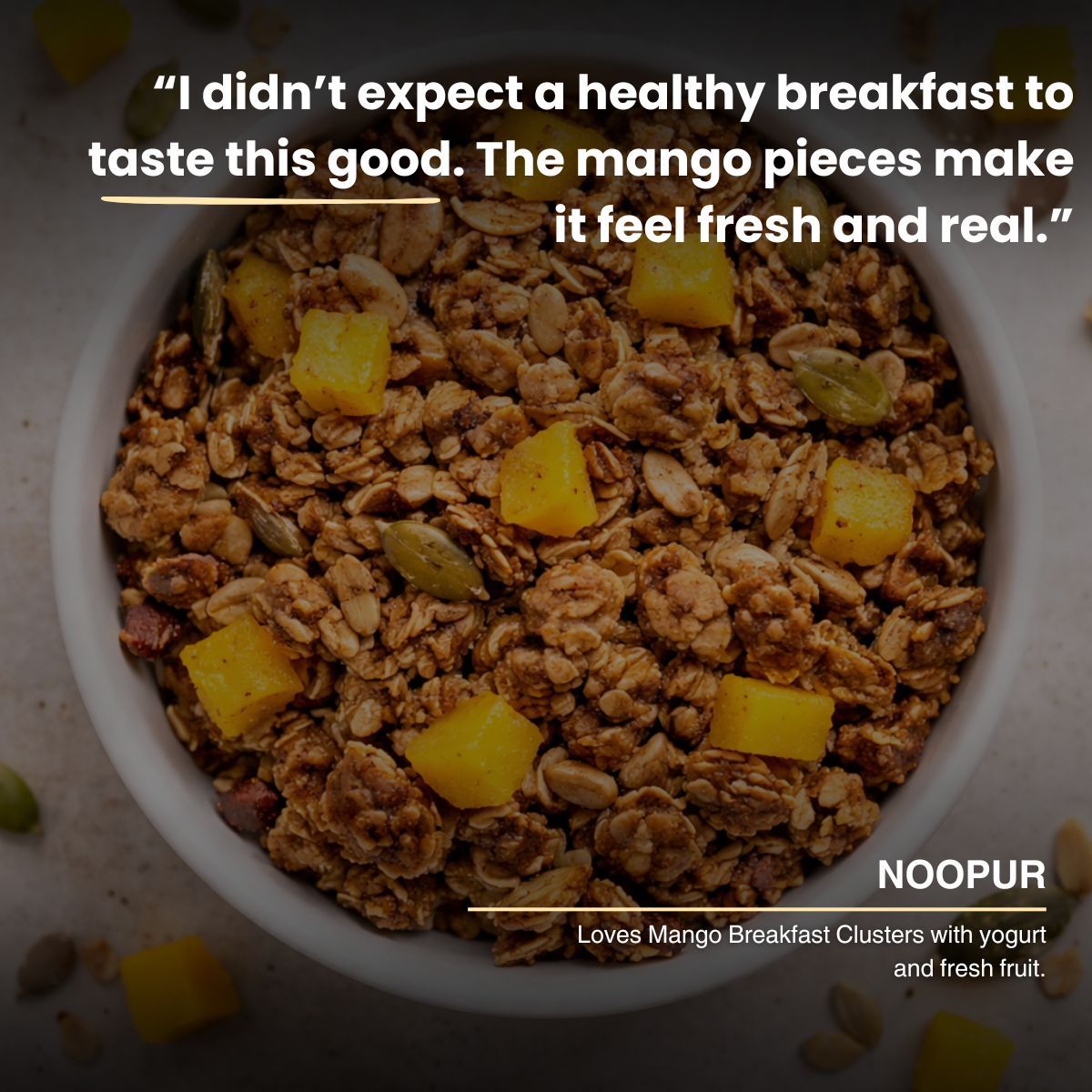 Mango Breakfast Clusters are high-protein breakfast clusters made with nuts, seeds, whey protein, and real freeze-dried mango pieces. They offer a grain-free, no-added-sugar alternative to traditional granola or muesli.
