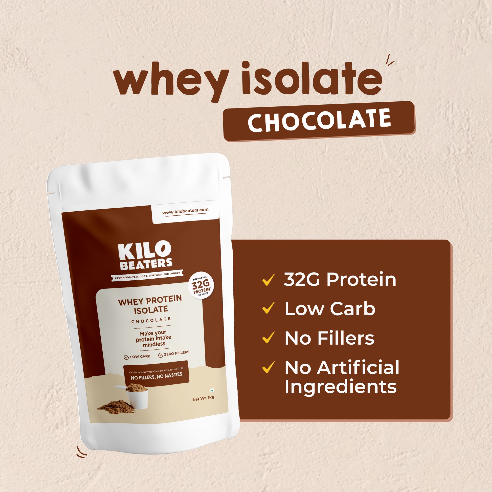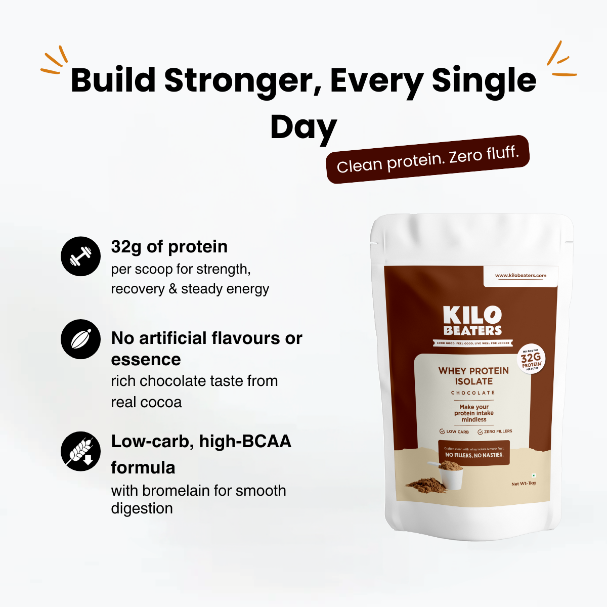 KiloBeaters uses high-purity whey isolate instead of concentrate, delivering 32g protein per serving with low carbs, zero added sugar, and real cocoa flavour. It’s cleaner, lighter, and easier to digest.