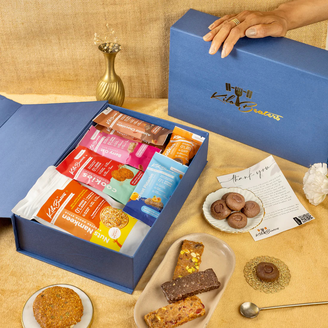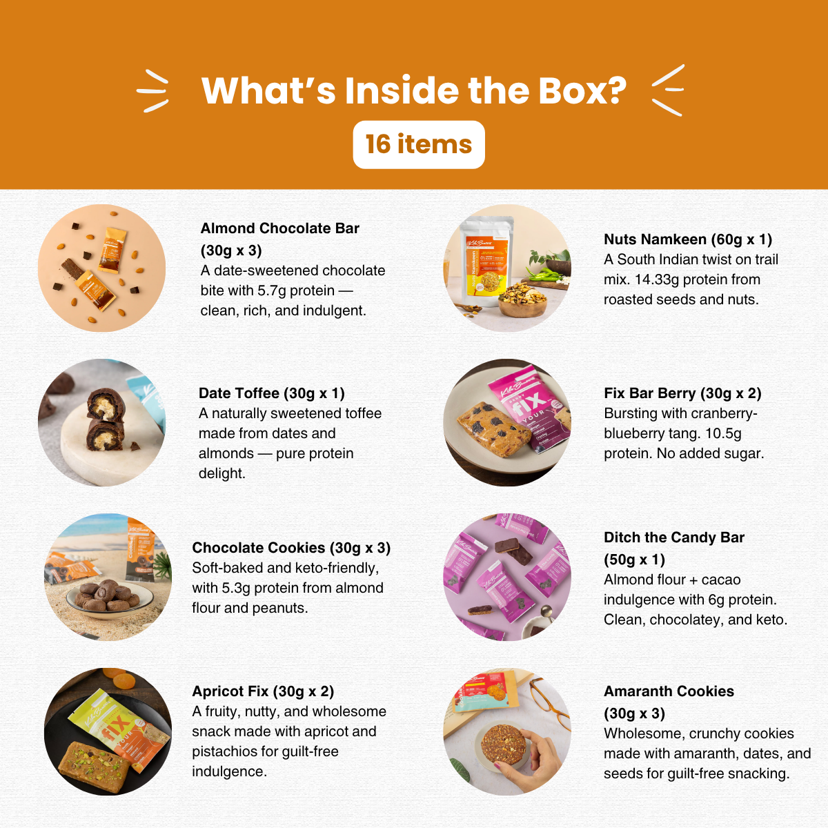 The box includes five snacks: Almond Chocolate Bar, Berry Oat Bar, Apricot Pistachio Bar, Keto-Friendly Chocolate Cookies, and Nuts Namkeen.