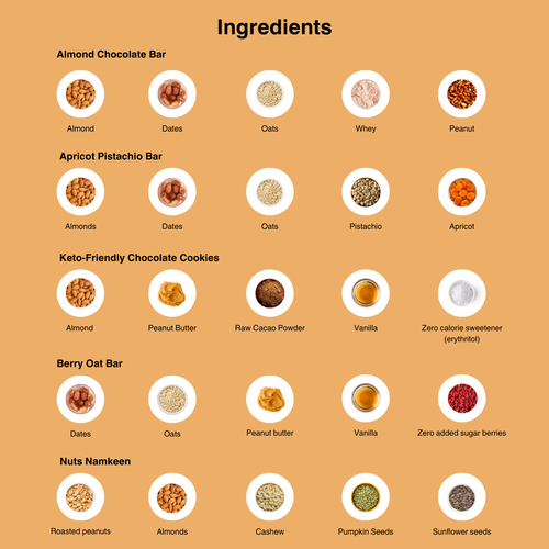 - Nuts Namkeen (60g): Almonds (22.4%), Peanuts (22.4%), Sunflower seeds (18.4%), Pumpkin seeds (12.4%), Dry coconut (8.4%), Garlic (4%), Green chilli (4%), Sesame oil (4%), Mustard seeds (1.2%), Curry leaves (0.5%), Hing (0.8%), Salt (1.5%)