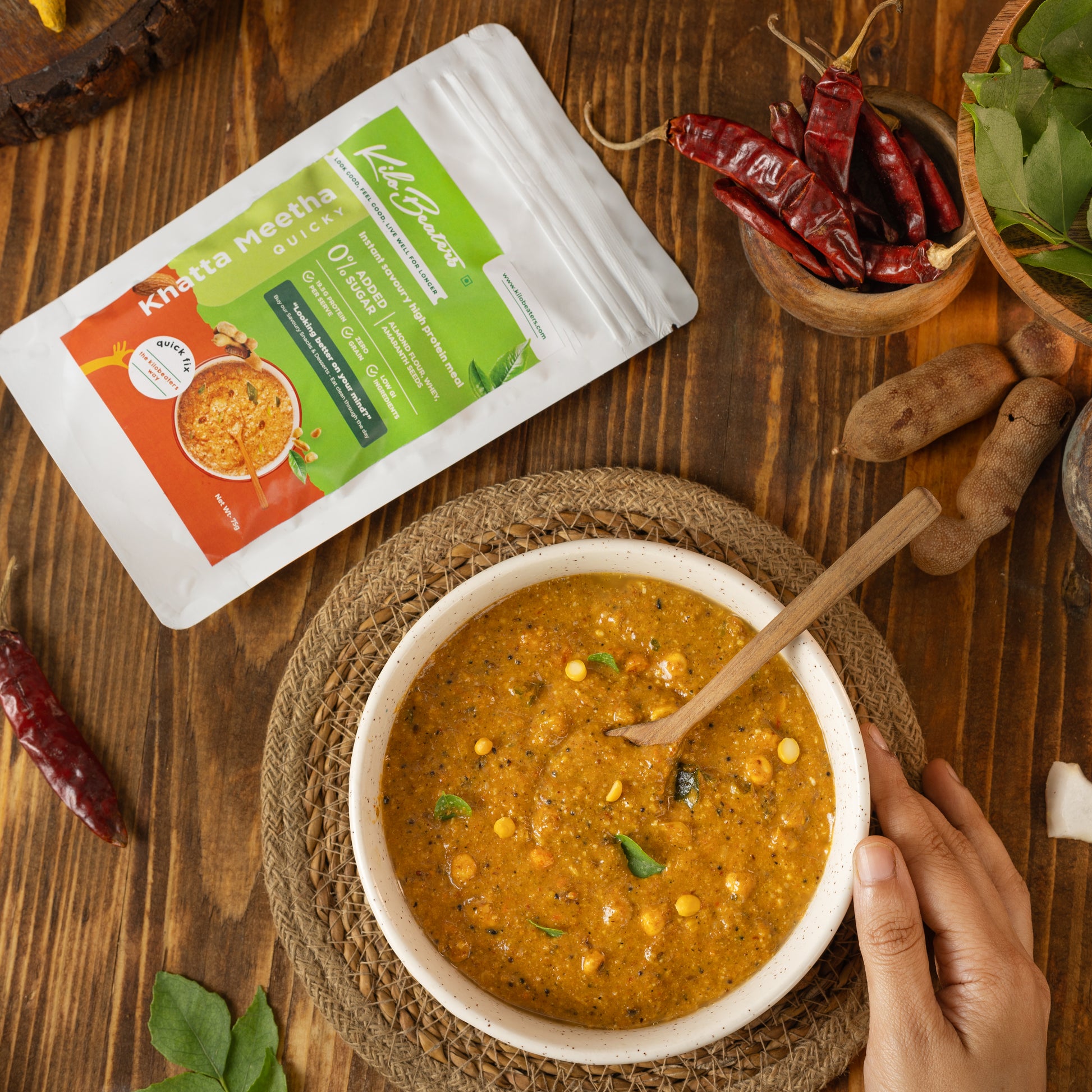 - Measure 75g of the Khatta Meetha Quicky mix into a bowl.