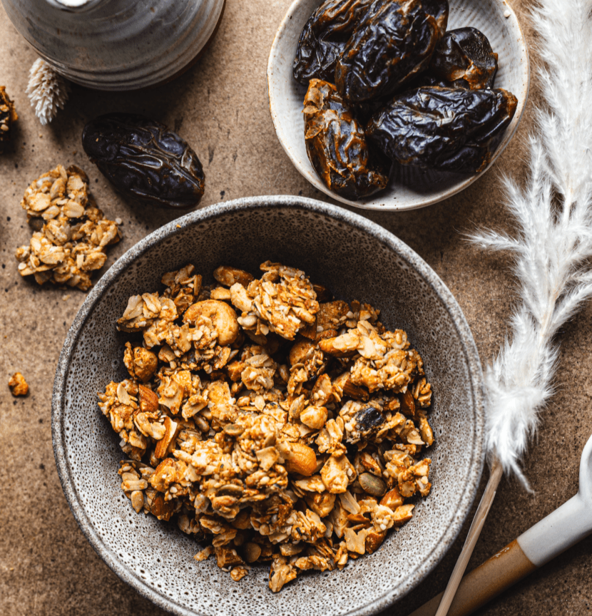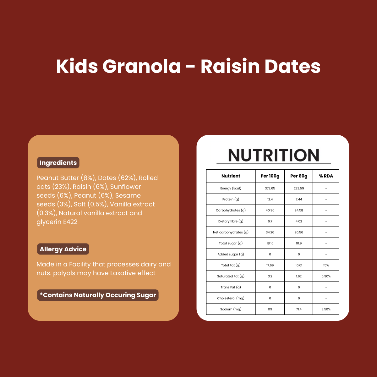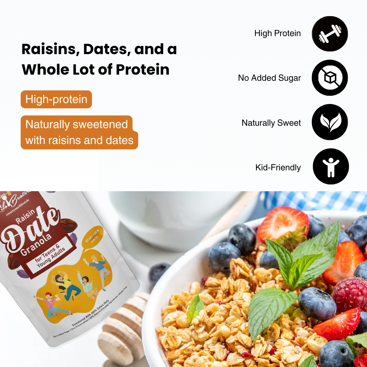 This granola is made from wholesome ingredients like rolled oats, raisins, dates, and sunflower seeds, providing a high-fiber, nutrient-rich breakfast with no added sugar, perfect for a nutritious start to the day.