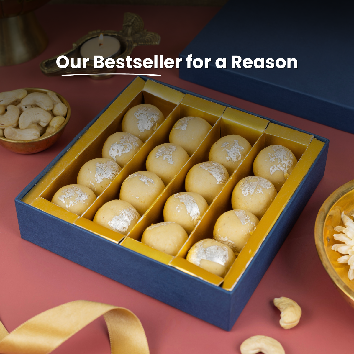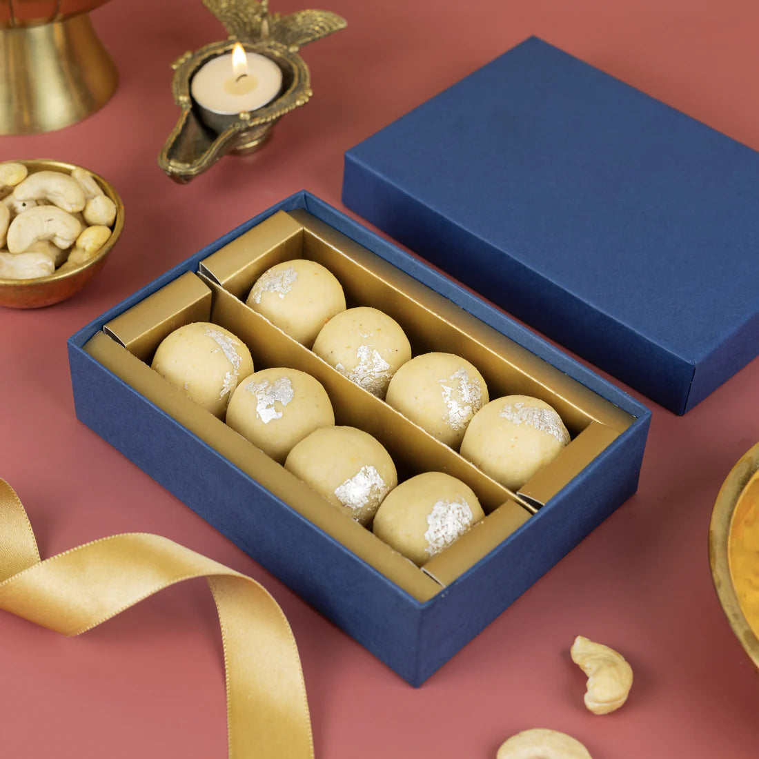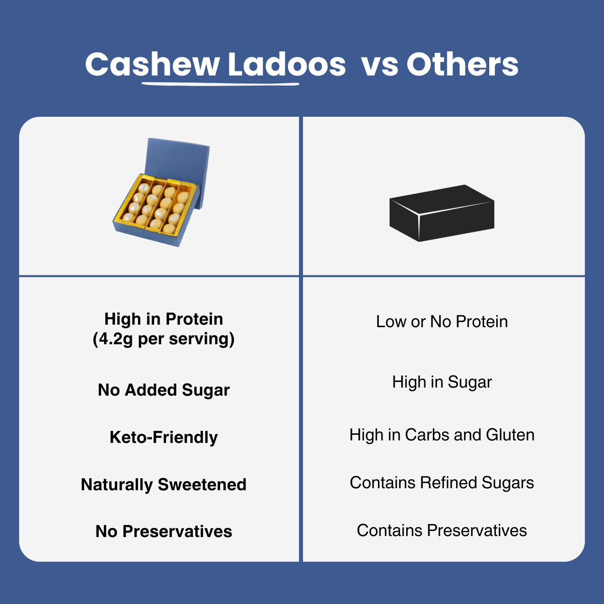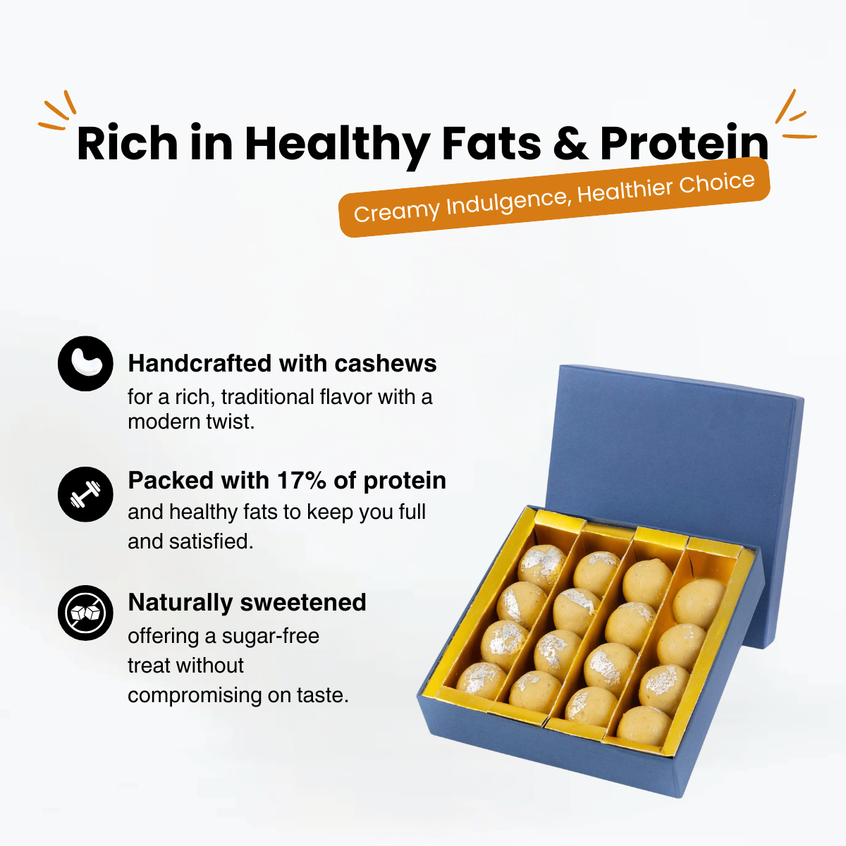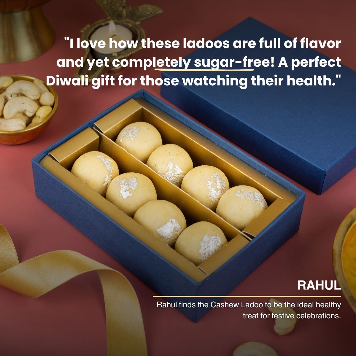 - Cashew Laddoo: Cashew, Ghee, Zero calorie sweetener, Cardamom