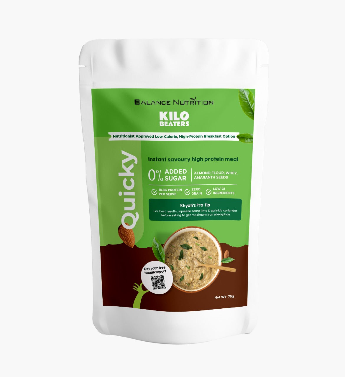 Each 75g serving of Quicky provides 18.8g of protein, making it an excellent high-protein breakfast option.