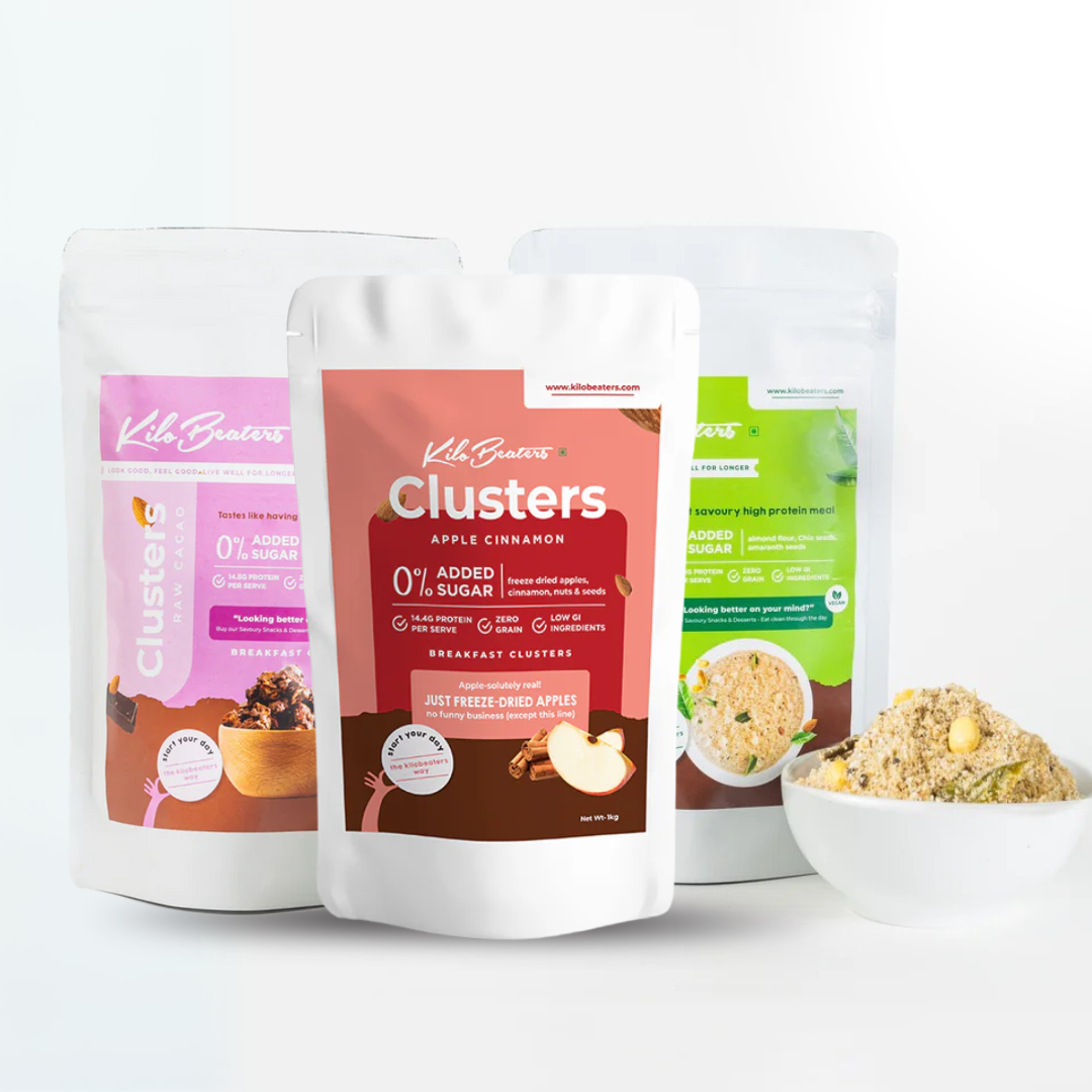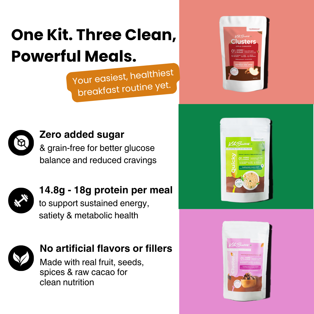 The kit includes Raw Cacao Clusters (1kg), Apple Cinnamon Clusters (1kg), and Quicky (900g) delivered fresh every month for 3 months.