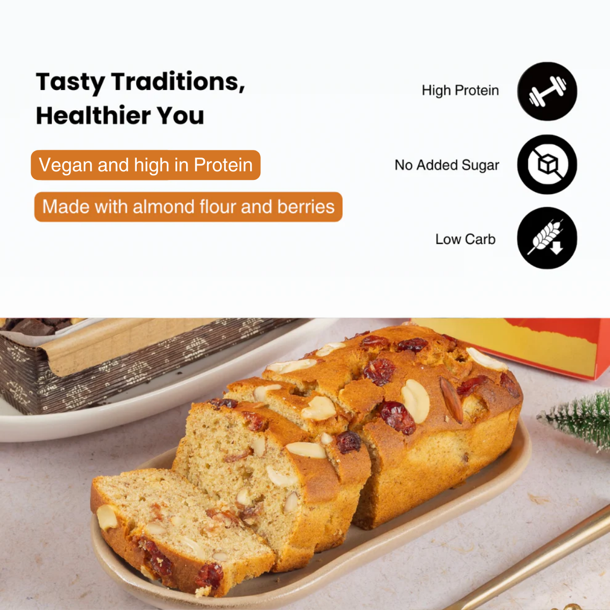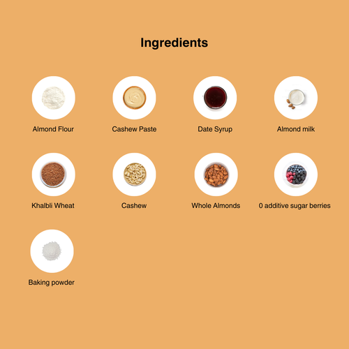 The cake is primarily made with 69% almond flour, along with cashew paste, dates syrup, almond milk, khalbli/khapli wheat, whole almonds, zero additive sugar berries and baking powder, creating a nutrient-dense, nut-rich dessert.