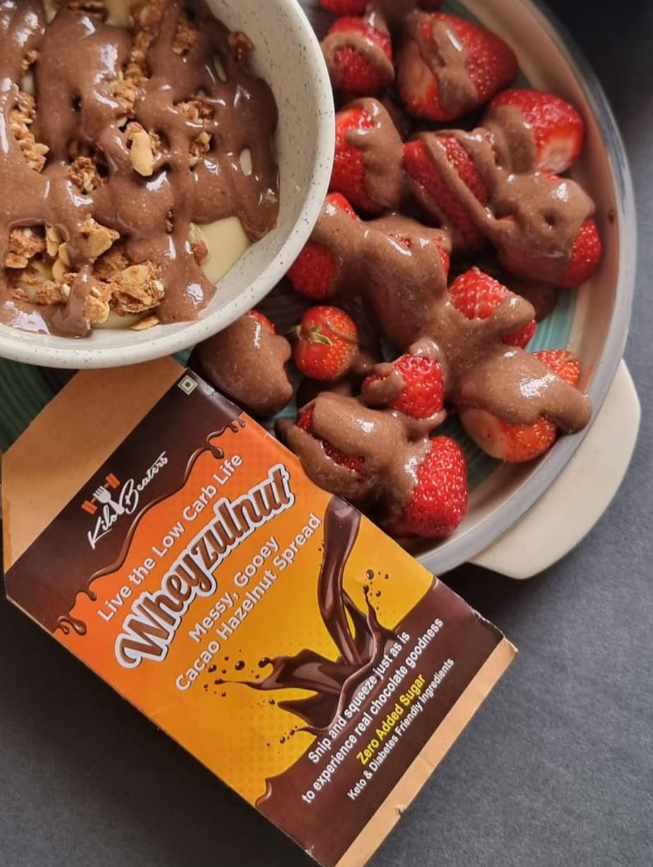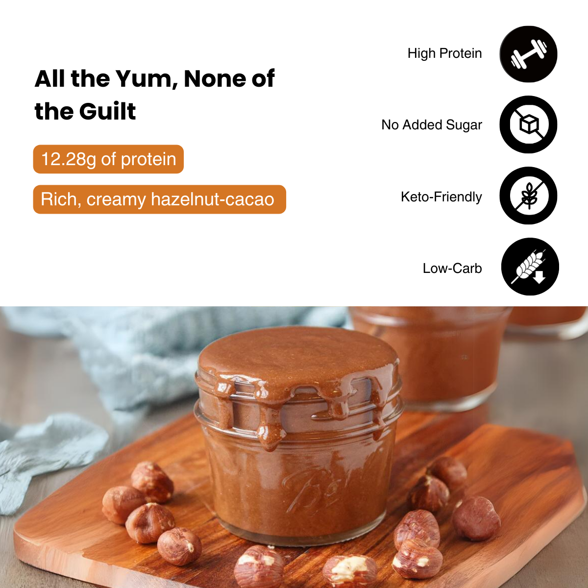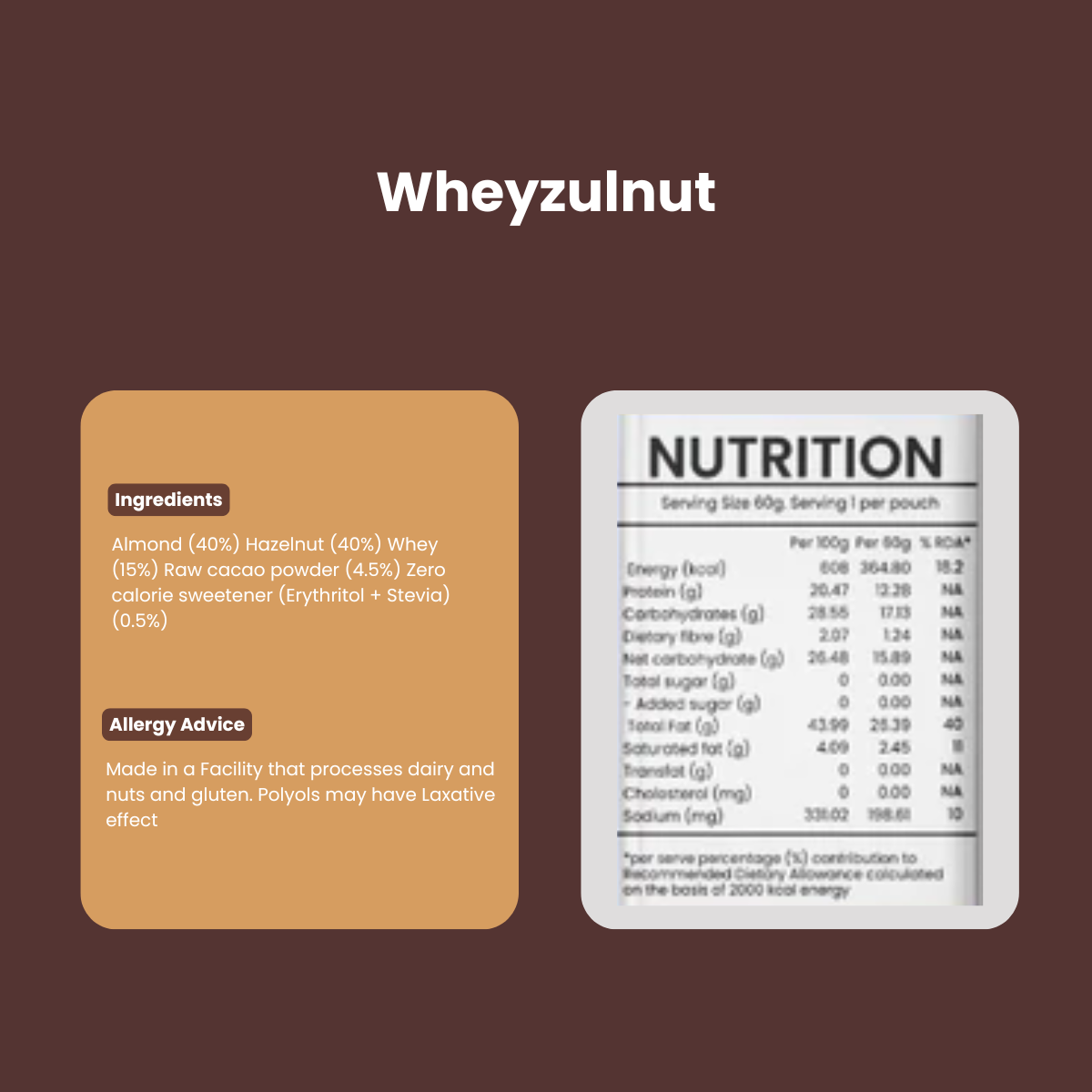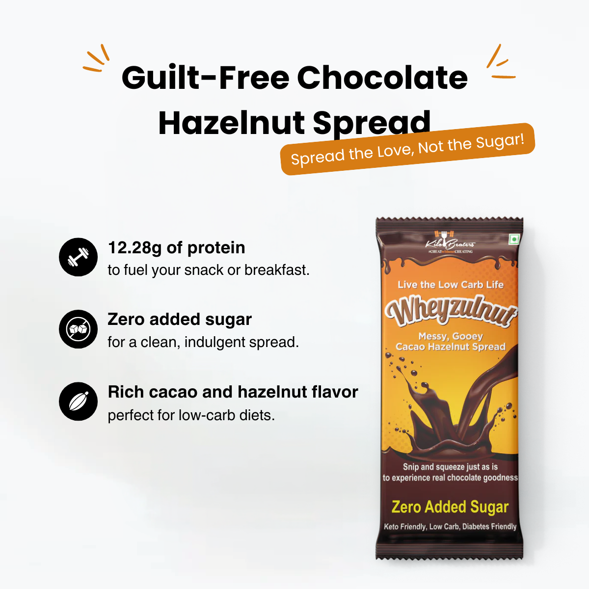 Wheyzulnut is a spread made from hazelnuts, almonds, whey protein, and raw cacao, with zero added sugars.